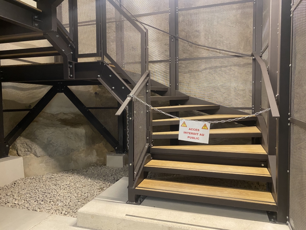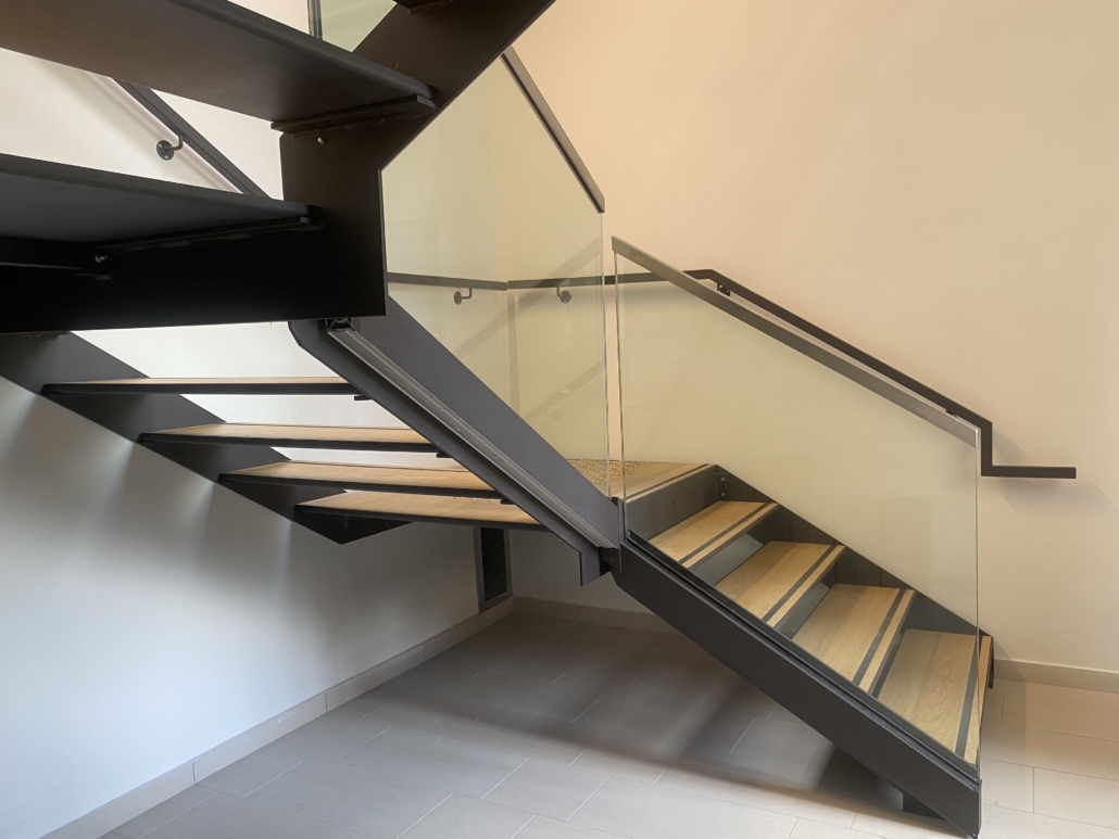 - Escaliers et garde-corps en acier, dessinés pour s’intégrer dans la trame architecturale existante